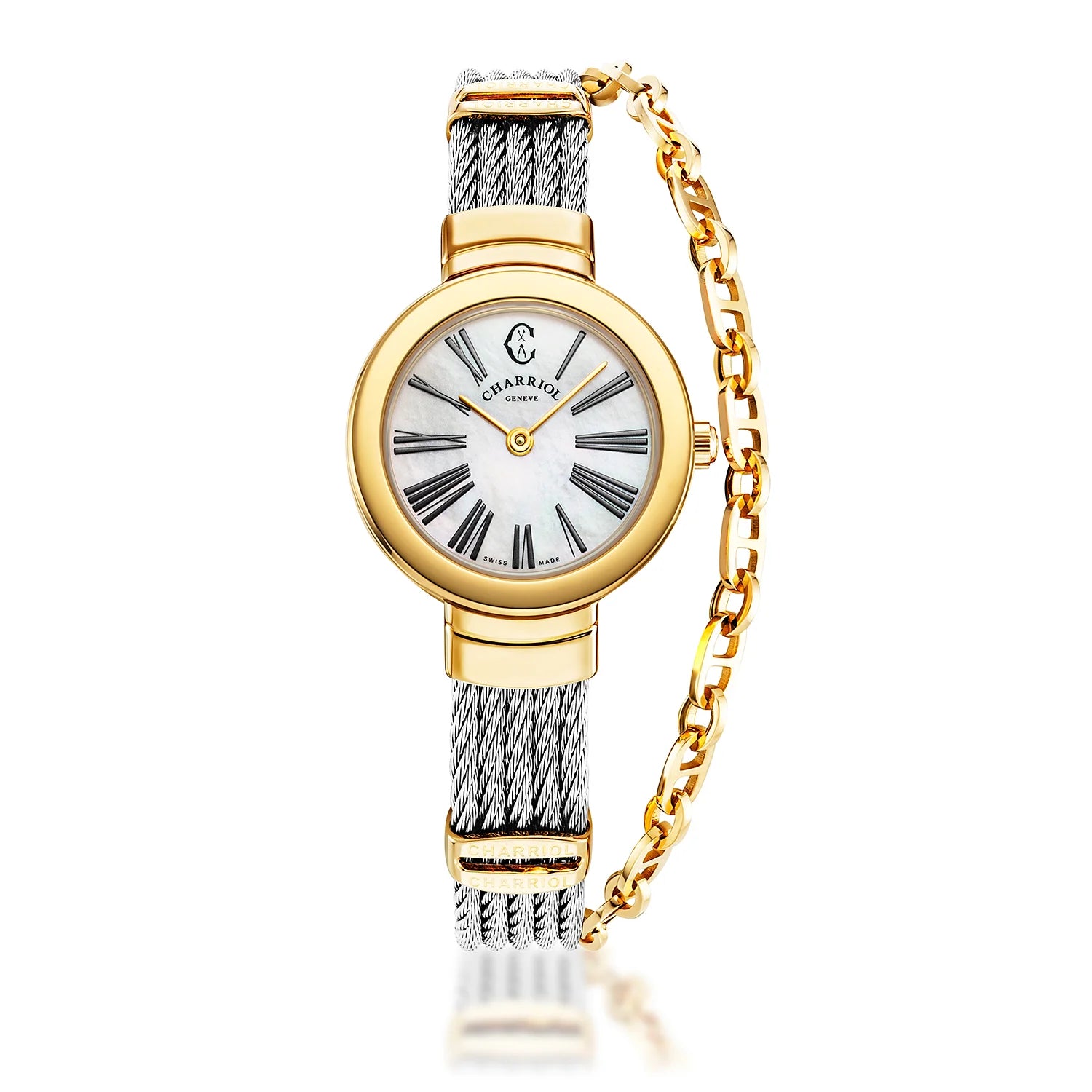 ST TROPEZ, 25MM, CUARZO CALIBRE, PERLA CON 11 DIAMANTES DIAL, ORO AMARILLO PVD BEZEL, ACERO CABLE PULSERA - Charriol Geneve - Watch